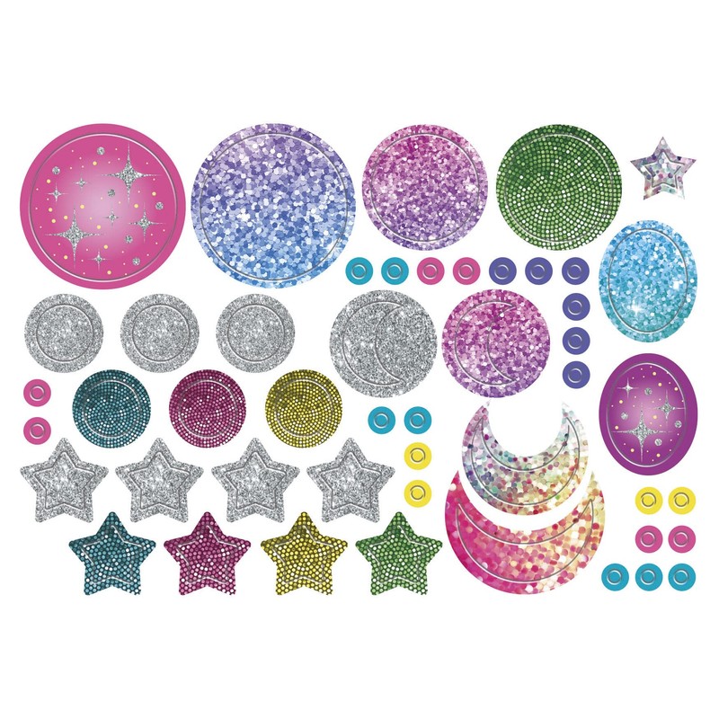 - The kit includes: aluminium chains and rings, metallic and coloured plastic pendants in moon and star shape, holographic stickers and an accessory holder.