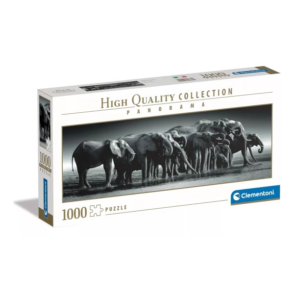 Este rompecabezas panorámico de 1000 piezas de la colección Clementoni High Quality presenta una impresionante imagen en blanco y negro de una manada de elefantes. Al completarlo, el rompecabezas mide aproximadamente 98 x 33 cm, ofreciendo una representación detallada y cautivadora de estos majestuosos animales en su entorno natural.