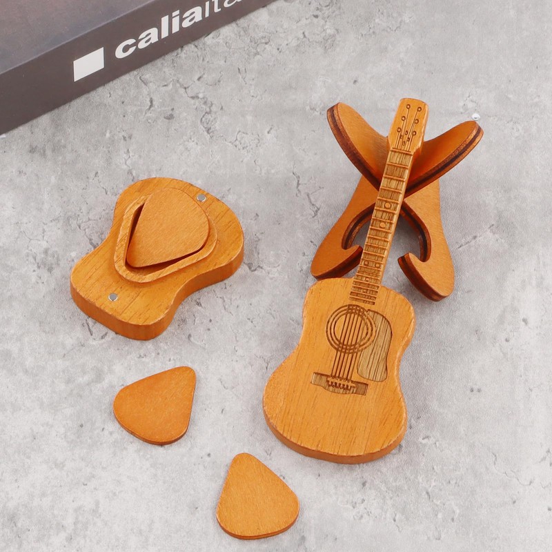 The guitar picks contain three wooden guitar picks and a pick storage box.