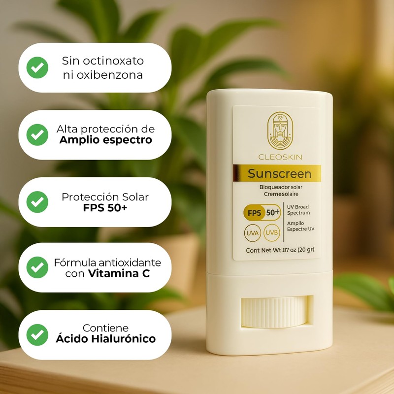 CLEOSKIN Bloqueador Solar en Barra FPS 50+ | Protección UVA/UVB | Con Vitamina C y Ácido Hialurónico | 20g | Facial y Corporal | Textura Invisible y No Grasa
