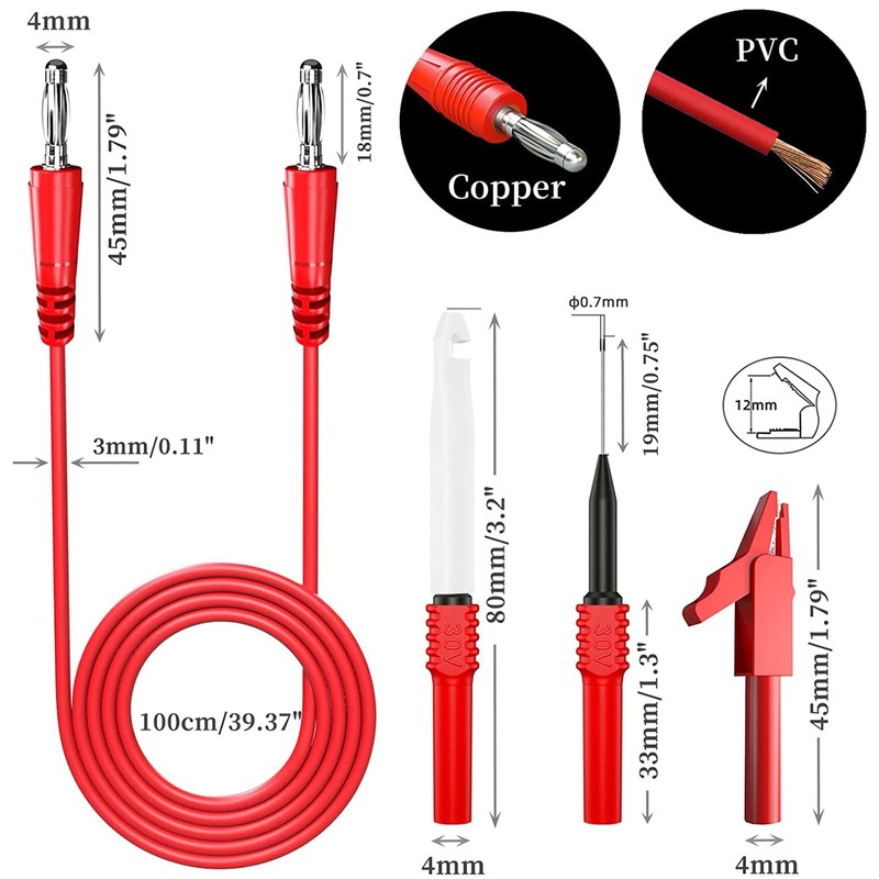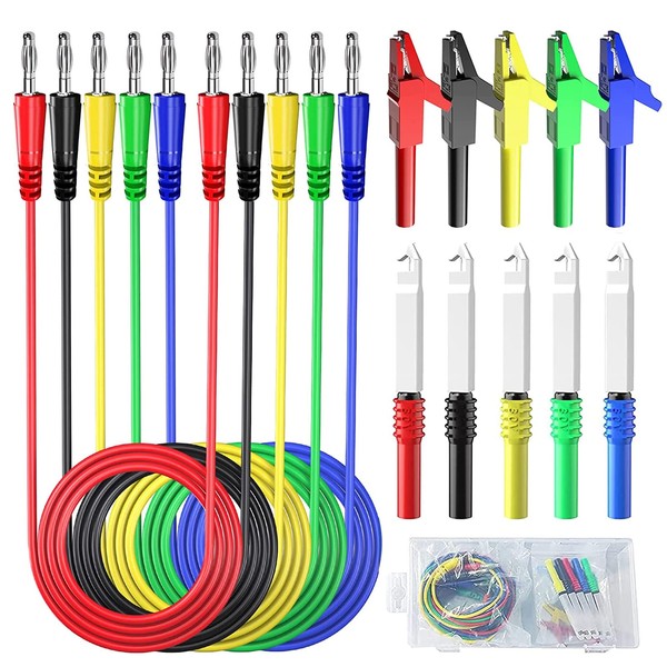 - Package included: 5 x Banana to Banana Plug Test Leads, 5 x Alligator Clips, 5 x Insulated Wire Piercing Probes, 1 x White Transparent Storage Box