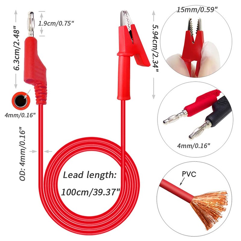 - One end of the test lead is a standard 4mm banana plug that can be stacked. The other end is an alligator clip insulated by pure copper. Lead Length: 3.3 ft (1 m) Voltage: 1000V Current: 15A