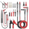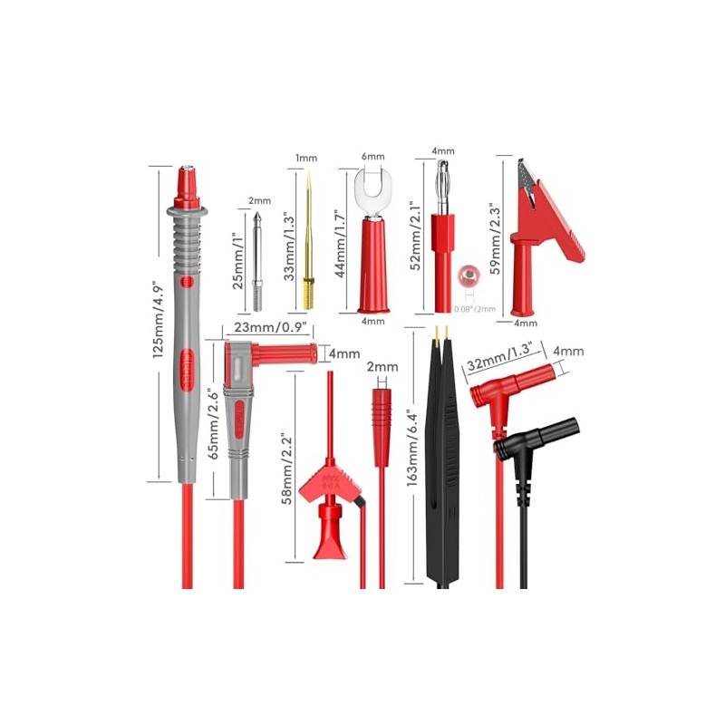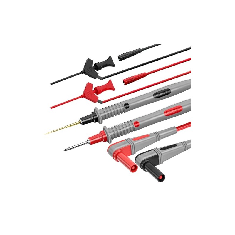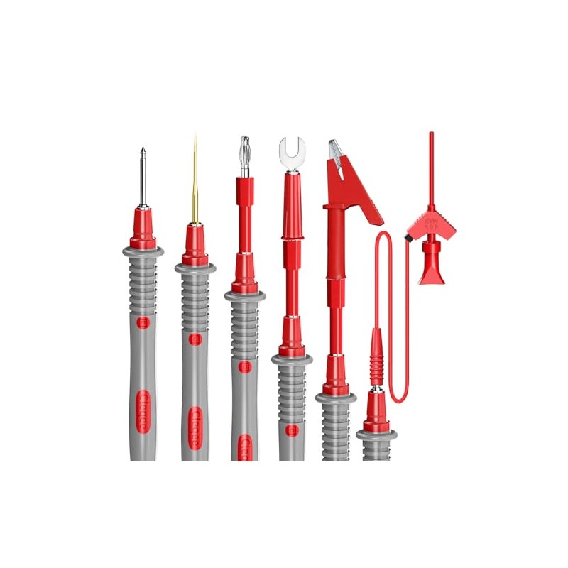 - Package include: 2PCS Multimeter Leads, 8PCS Replaceable Needles, 2PCS 4mm Banana Plug Connectors, 2PCS U-Type Adapters, 2PCS Heavy Duty Alligator Clips, 2PCS SMD IC test hook clips with extension leads, 2PCS Safety Caps, 1PC Test Probe Tweezer.