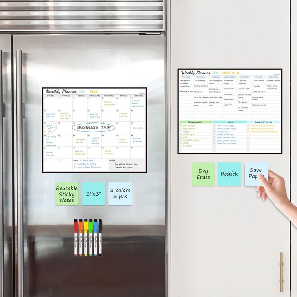 Clever Clean Dry Erase Monthly Calendar and Weekly Planner 16.55"x13.5", Restickable Whiteboard Calendar Sticks to Most Smooth Surfaces. Along with 3 Colors Reusable Sticky Notes 3"x3" 6-Pack.