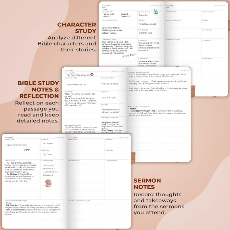 - SPACE FOR SERMON NOTES & CHARACTER STUDY – The womens bible study journal is divided into 3 parts, including sermon notes, verse study, and character study. The Study the Bible notebook also includes a prayer list and a list for your favorite verses.