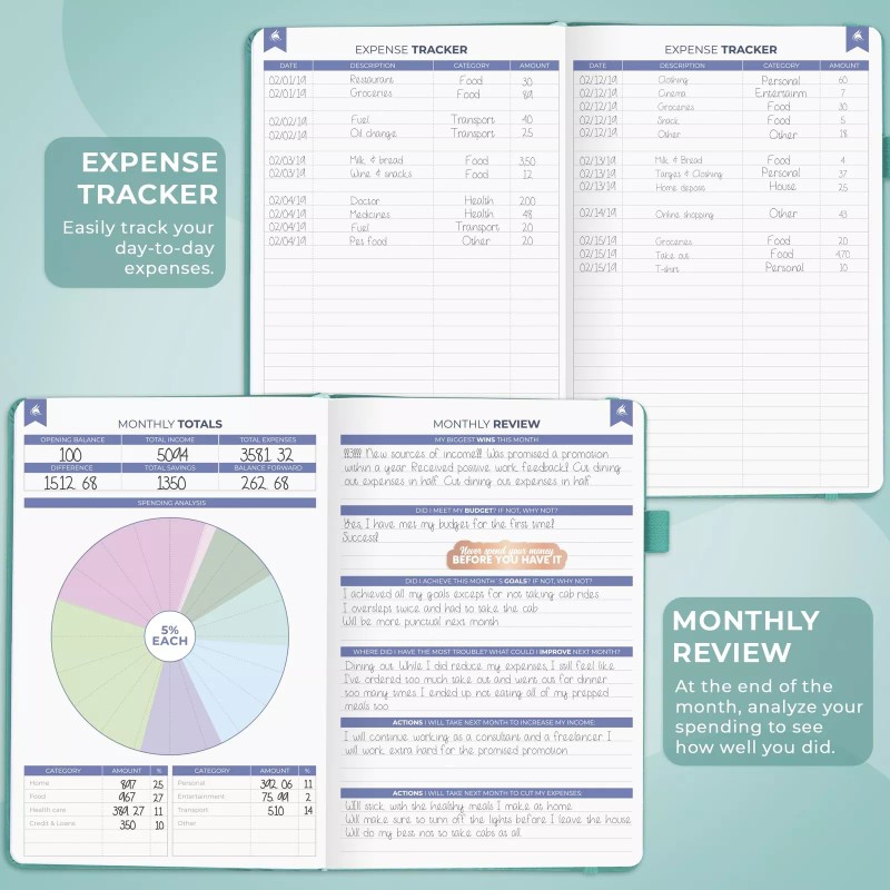 • EASILY CONTROL YOUR SPENDING, DEBTS & SAVINGS: This money planner is undated and covers 12 months. Every month features a calendar, budget plan, and expense tracker. The budgeting planner also includes 8 savings and 12 debt trackers, and a holiday budget.