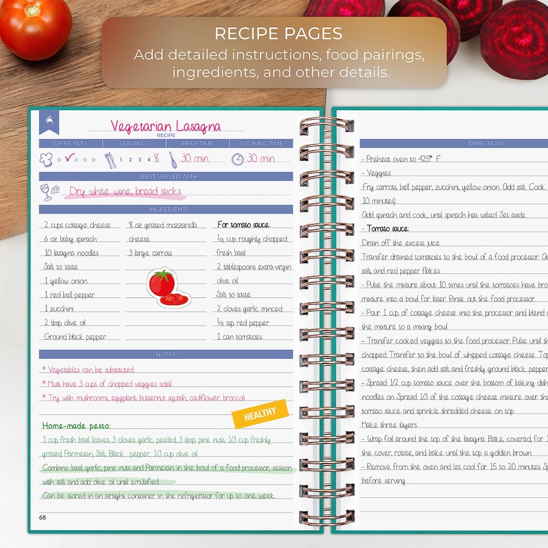 • PERFECT GIFT FOR FOODIES – This recipe planner has a beautifully engraved hardcover andes with 3 sheets of colorful stickers, making it an excellent gift for anyone who loves cooking.
