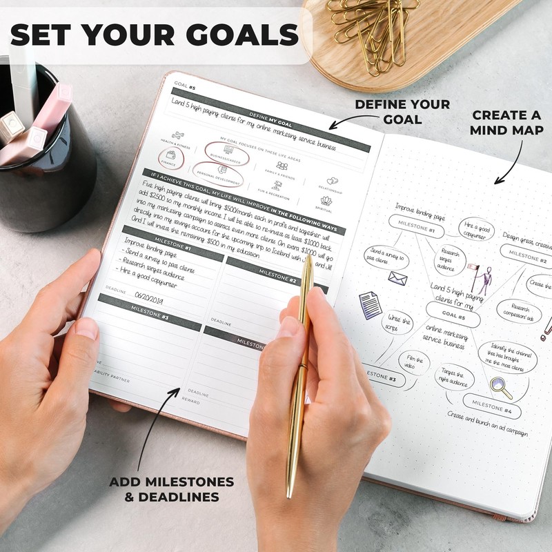 - SUPPORT YOUR WORK-LIFE BALANCE – This goal setting planner includes daily prompts to practice gratitude and affirmations, track habits and routines, and plan various activities to support your overall well-being.