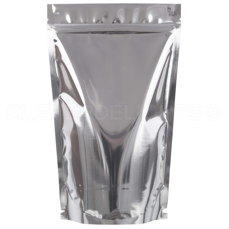 CleverDelights premium 16 ounce silver stand-up pouches are perfect for a variety of uses from retail sales to personal storage. 500 pack carton. The protective interior lining provides an additional barrier from external elements. Tear-notched flaps above the zipper lock can be heat sealed for long-term storage (requires a heat sealer -- sold separately). Once opened, the pouches also feature a re-closeable zipper lock for convenient access and transport. Approximate dimensions are 7 x 11.5 x 4 inch and are ideal for storing and selling all kinds of items ranging from household trinkets to moisture-sensitive items.