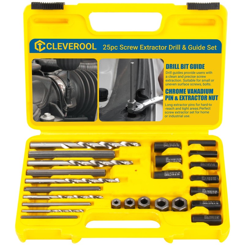 CLEVEROOL Broken Bolt Extractor, 25-Piece Drill Bit Extractor Set,Easy Out Drill Bit Guides,Drill Extractor Kit for Removing Stripped,Damaged,Rusted, Rounded-Off Bolts, Automotive Nuts & Screws