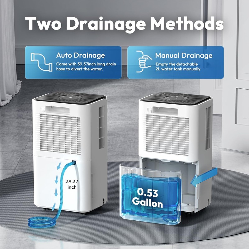 The LUKO dehumidifier removes up to 30 pints of moisture per day (95°F, 90% RH) and effectively covers areas up to 2,000 sq. ft.. With a powerful 180m³/h air circulation system, it quickly reduces excess humidity to protect walls, furniture, and appliances—ideal for use in basements, bedrooms, bathrooms, living rooms, kitchens, garages, and more.