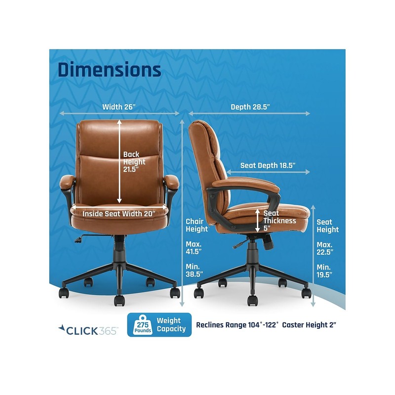 Bring relaxation to your busy workday with the Click 365 Extra Comfort Ergonomic Mid Back Desk Chair. This chair deliver American comfort with ultra plush padding in headrests, back rests and seat cushions. This chair has a contoured 5 inch thick seat cushion and reliable ergonomic support, providing long lasting comfort and is perfect for everyday use at home and in the office. Pneumatic adjustable height, a swivel base design, and top-graded smooth rolling caster ensure the office chair is easy to move and position. This desk chair is upholstered in premium durable bonded leather, high density foam, heavy duty metal base, with sophisticated stitching. You can purchase this chair with confidence