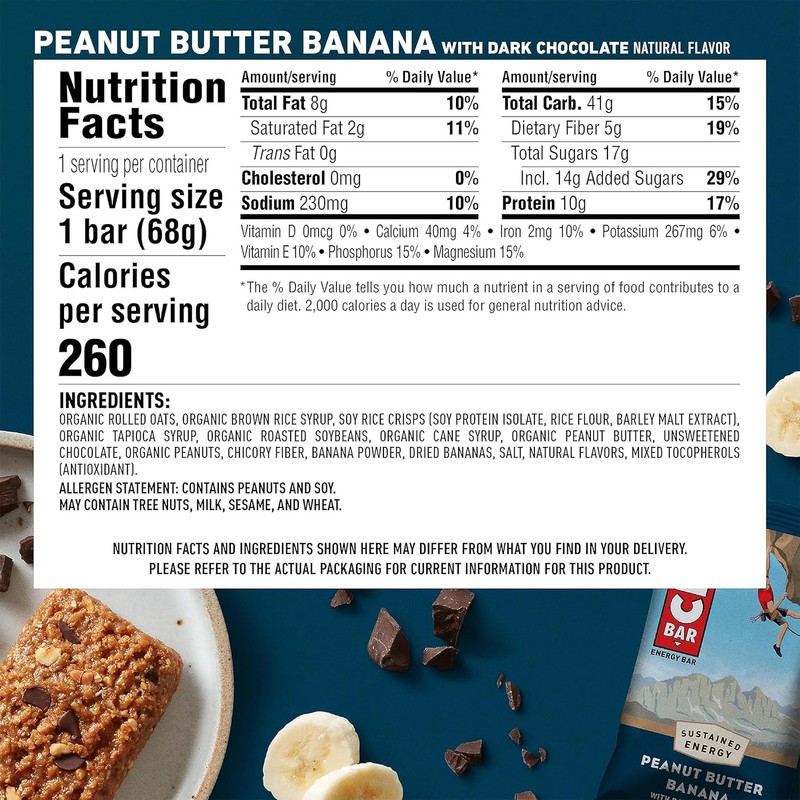 Clif Bar - Peanut Butter Banana with Dark Chocolate Flavor - Made with Organic Oats - 10g Protein - Non-GMO - Plant Based - Energy Bars - 2.4 oz. (10 Pack)