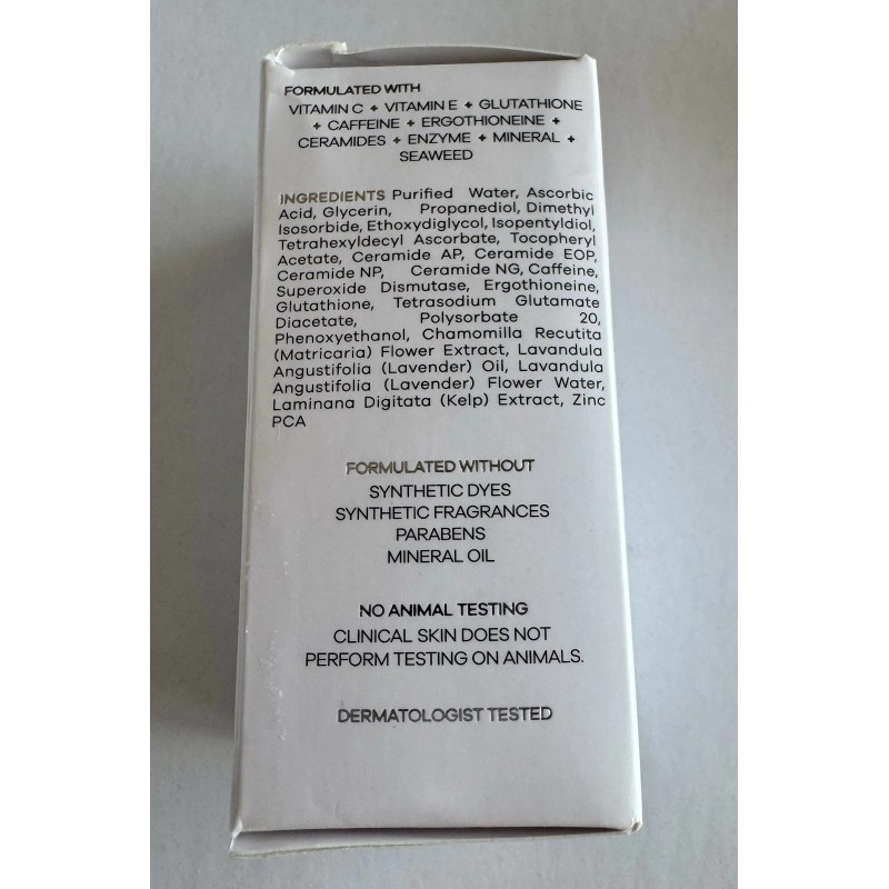 - Ingredients: Caffeine, Glycerin, Water, Ascorbic Acid, Tetrahexyldecyl Ascorbate, Ergothioneine, Tocopheryl Acetate