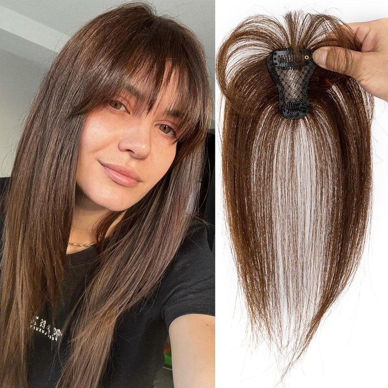 Clip in Bangs 100% Human Hair 360° Cover Bangs Hair Clip on Bangs Hair Pieces for Women Hair Toppers Air Bangs for Daily Wear (Brown)