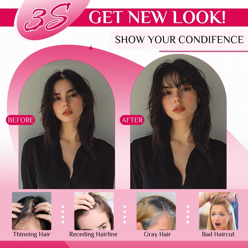 - Instant thickening and modification: this fluffy hair topper women's real hair covers the forehead quickly and effectively, changes the face shape and allows the amount of hair on the top of the head to grow visually. It perfectly fixes common problems such as high hairline, wide parting, thinning hair and grey hair and improves the entire hairstyle immediately. For more fullness and confidence.