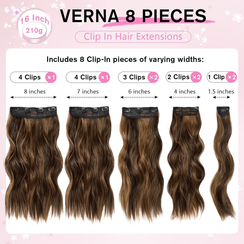 - 【High Quality and Natural】This clip in hair extensions includes 8 pieces weighing 210±5g, made of high-quality synthetic fibers. The extensions feature natural curls, and are soft, smooth, and comfortable to wear. The clips are strong and secure.It's easy to apply and re-apply. The natural waves blend seamlessly with your own hair to give you a beautiful, voluminous curly look