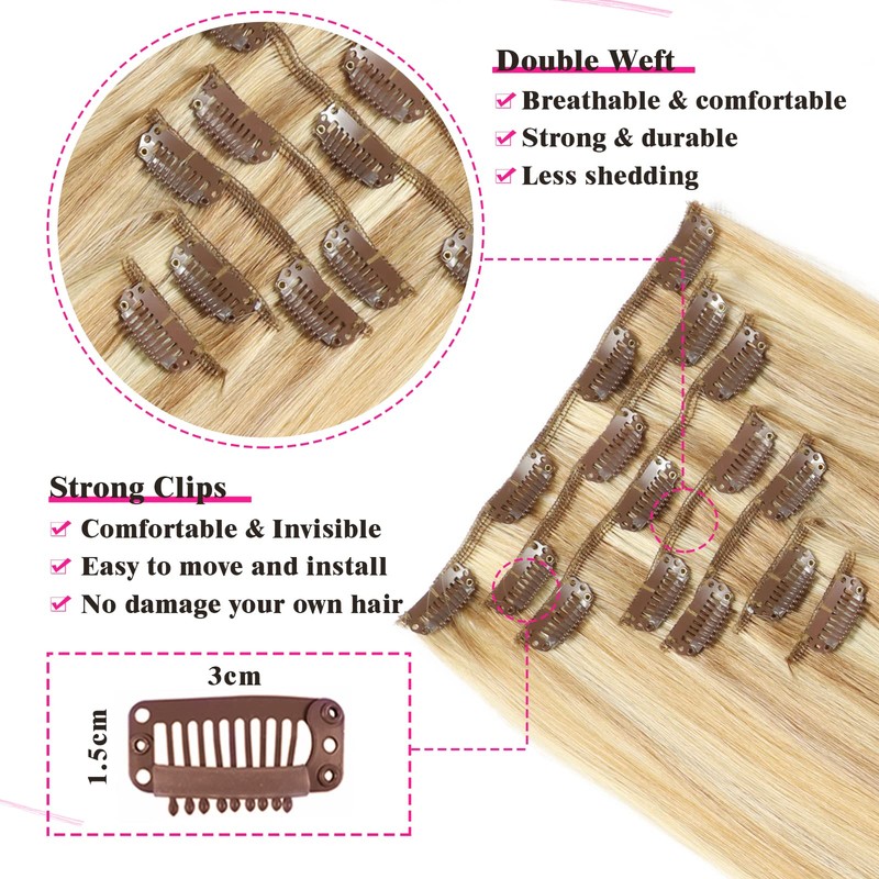 - CLIP IN HAIR EXTENSIONS SPECIFICATION:Available in lengths from 14 "to 22", 70g/7pcs/16 clips per set. Usually two or three packs are enough, but if you want your hair to look thick, more than two packs are recommended