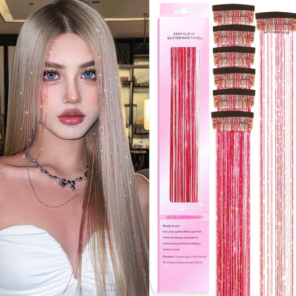 Clip in Hair Tinsel Kit, 6Pcs 20Inch Heat Resistant Glitter Fairy Hair Tinsel Clip in Extensions, Shiny Sparkle Hair Accessories for Women Girls Kids (Red)