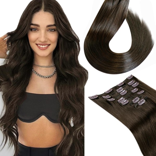 Clip in Human Hair Extensions Darkest Brown Hair Extensions Real Human Hair Clip ins Dark Brown Remy Hair Extensions Double Weft Long Straight Hair Extensions 22 inch 7pcs 120g