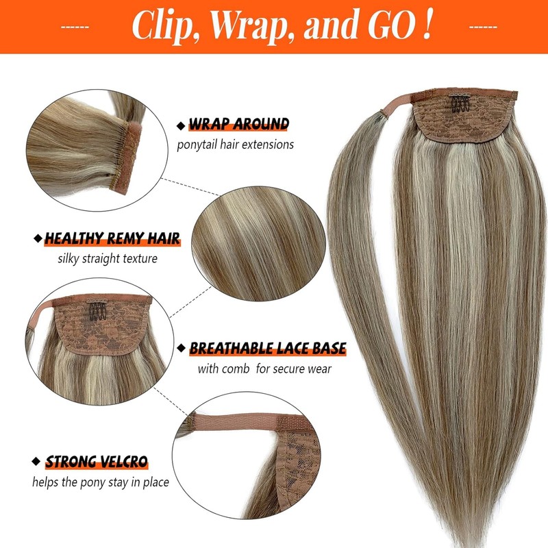 Clip in Ponytail Hair Extensions Human Hair for Thin Hair Blonde Highlights Ponytail Extensions Wrap Around 20 Inch 80G Silky Straight Brown and Blonde Ponytail Hair Pieces with Clips