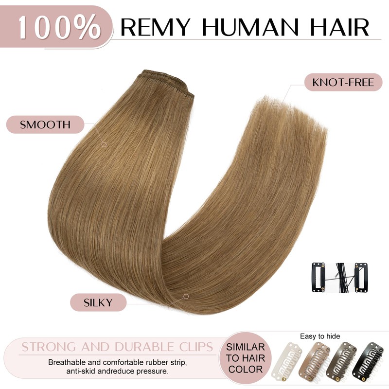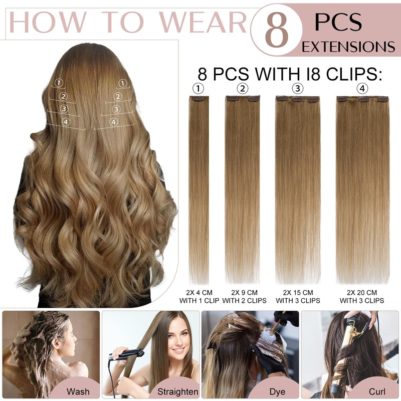 - Seamless clip-in hair extensions: Pack of 8 with 18 clips. The pressure-sensitive clips and seamless weft threads lie flat on your scalp, making them virtually undetectable.