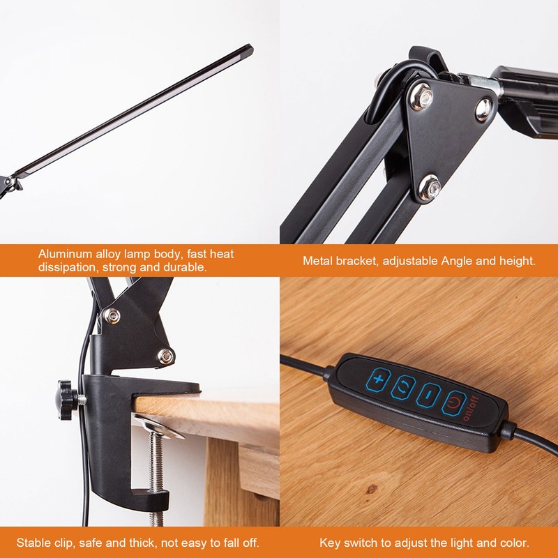 1、Stepless dimming, no stroboscopic, uniform and not dazzling, protect your eyes, 3 color temperatures, each color temperature and brightness can be adjusted to meet your different lighting needs, and create a warm and comfortable environment for you. 2、Multiple angles and directions can be adjusted, 270‑degree rotating lamp holder, 180‑degree adjustable metal arm, 360‑degree rotating base, angle and direction can be adjusted freely, to meet the needs of different angles of light. 3、Environmental protection and energy saving, energy‑saving lamp beads, high brightness but energy saving, brightness reaches 12W, 80% energy saving than traditional light bulbs, life span is 60,000 hours, no need to replace, energy saving. 4、Using high‑quality aluminum alloy and high‑end technology, the appearance is stylish and generous, with texture, good quality, and durable. The detailed design of ultra‑wide metal clip + sponge cushion can not only install the lamp firmly on the table, but also protect the table from damage. 5、It is easy to disassemble, save space, and has a wide range of use. It is convenient to install on a desk, workbench or table. It is suitable for reading enthusiasts, repairers, welders, beauticians, jewelers, artists, collectors, architects, coin sculptors, etc.