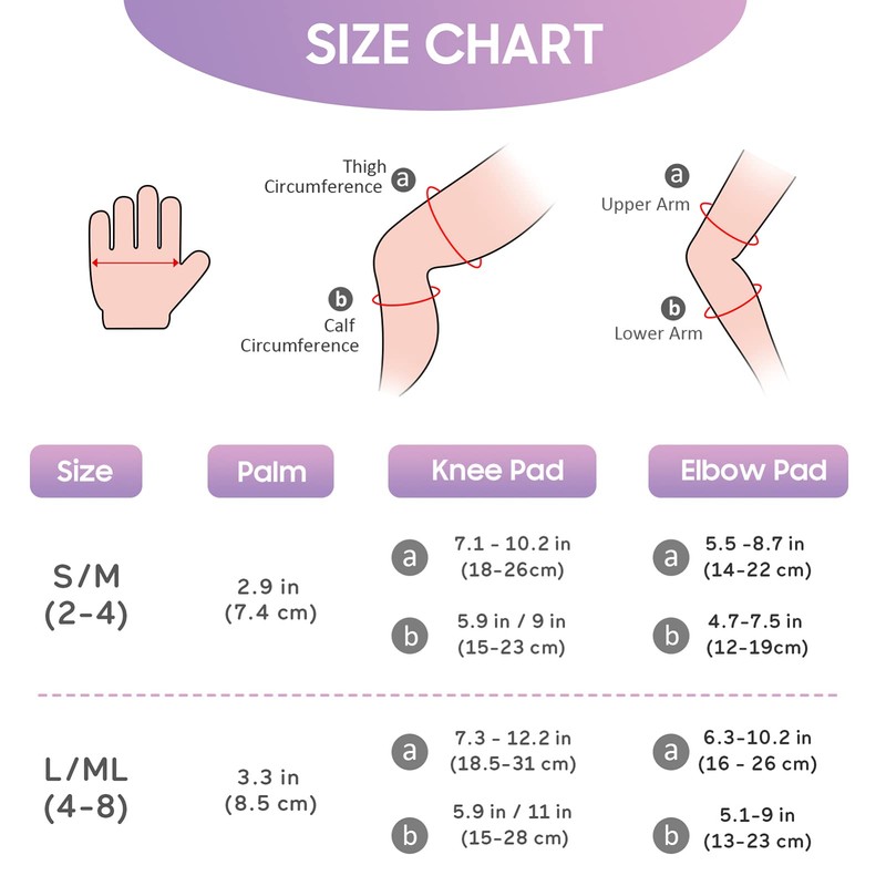 - Knee Pads and Elbow Pads: One Size. Suitable for children aged 2-8.