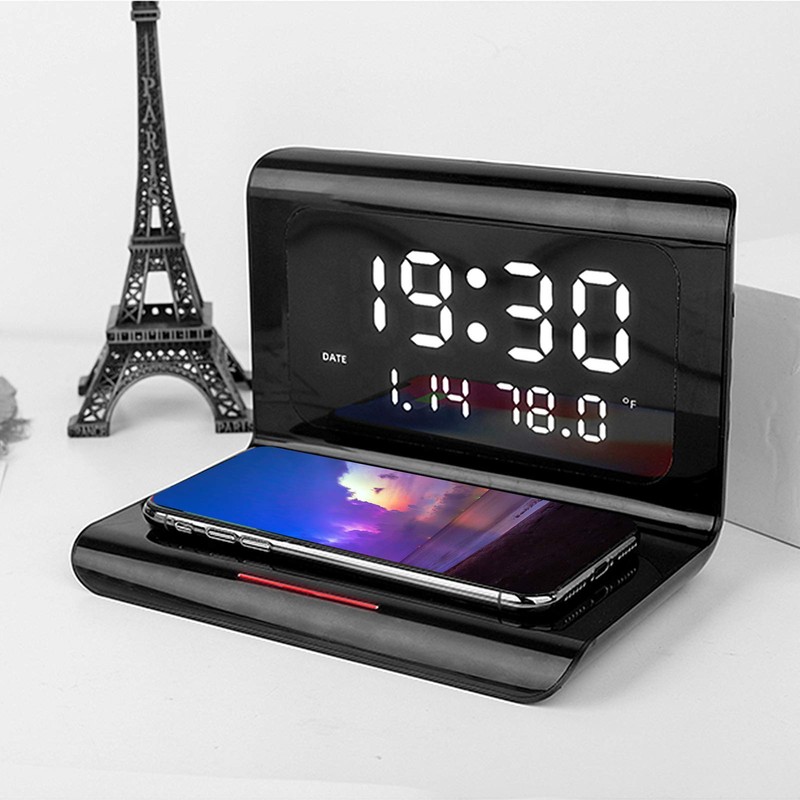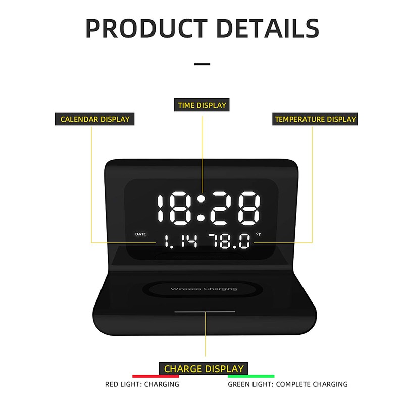 Clock Wireless Charger, MultiFunctional Digital Alarm Clock with Qi Wireless Charging Electronic Calendar Phone Wireless Automatic Matching Charger(black)