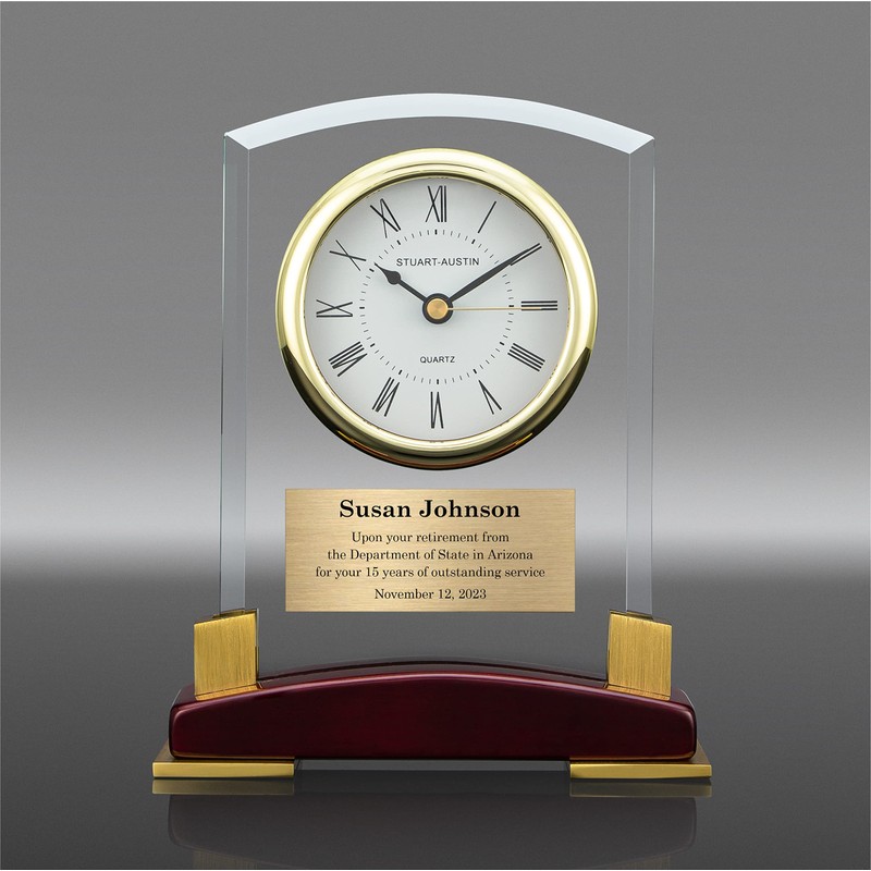 - - A TIMELESS CLASSIC - This beautiful glass clock with rosewood base is the perfect way to keep track of time. The gold clock and plate are customized with your name and special message, making it a great retirement gift! This clock is a great way to commemorate a special event or occasion in your life, such as retirement, an anniversary, birthday, or graduation. The personalized plate on the front of the clock can be personalized with any text you choose to make it truly unique and memorable.