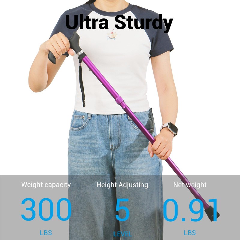 - LIGHTWEIGHT & ADJUSTABLE: Foldable cane it is made of ultra-lightweight and corrosion-resistant aluminum with a 1.2 mm thick tube, 1.5 times thicker than others, enough to support 200 - 250 pounds of weight. The cane has 5 levels of height adjustment in 1 inch increments and the height can be adjusted between 32" and 37", making it a great walking canes for seniors, women & men for balance.