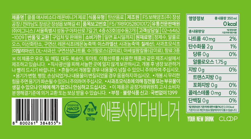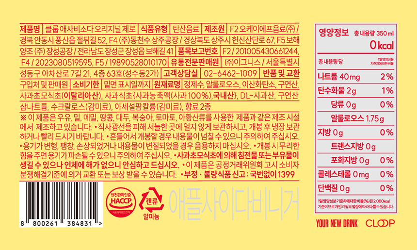 Cloop Asabi Soda Lemon Vinegar Zero 350ml 24 cans / 클룹 애사비소다 레몬비니거 제로 350ml 24캔