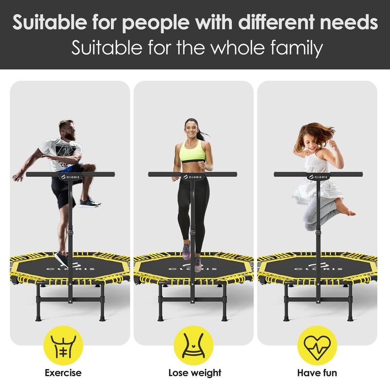 - 【SAFE AND FUN】 The padded handlebar is adjustable from 32.6” to 40.5” which fits your kid’s height perfectly. Kids can use the handlebar for easy grip to control their bounce. This springless trampoline is safer than the spring rebounders, primarily due to more soft parts. There is less of a chance of experiencing pinched fingers or toes, regardless of the safety precautions in place. Moreover, this trampoline has been added with a covering on top of the bands to provide safer jump pad surface