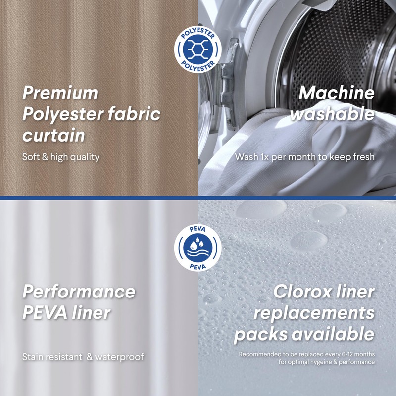 - QUALITY FABRIC: Designed in versatile beige tan, this shower curtain is made with 100% polyester and treated with a Clorox agent designed to repel moisture and stains and stand up to daily use.