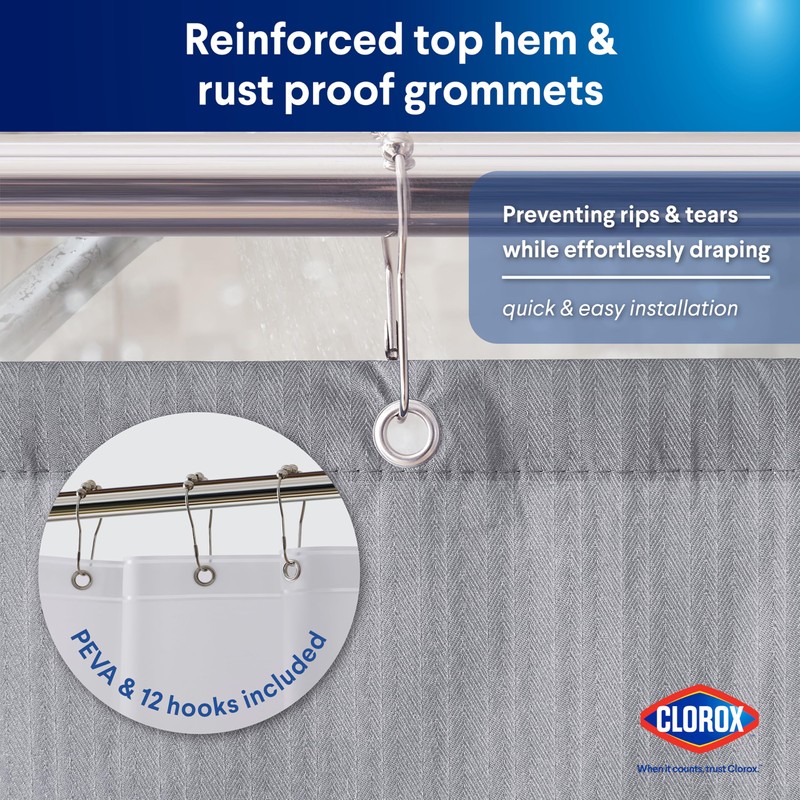 CLOROX Bathroom Shower Curtain with Waterproof Lightweight PEVA Liner Set, Standard Size for Bathroom, with Weighted Magnets and 12 Metal Hooks - 70" x 72" Grey