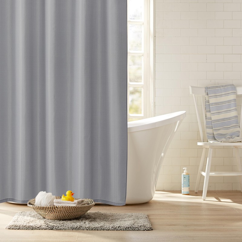 - QUALITY FABRIC: Designed in versatile grey, this shower curtain is made with 100% polyester and treated with a Clorox agent designed to repel moisture and stains and stand up to daily use.