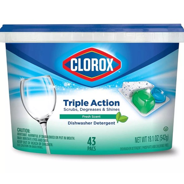 Keep your dishwasher clean and fresh with Clorox Triple Action Dishwashing Detergent. This pack includes 43 pods of the popular dishwasher detergent, designed to make your cleaning routine more efficient.