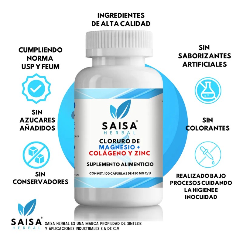 - Cloruro de Magnesio + Colágeno y Zinc de Saisa Herbal es un suplemento alimenticio diseñado para quienes buscan mejorar su bienestar general. Cada frasco contiene 100 cápsulas, proporcionando una dosis efectiva de magnesio, colágeno y zinc, ingredientes esenciales para el mantenimiento de la salud ósea, la piel y el sistema inmunológico. Este producto es orgánico y libre de gluten, lo que lo convierte en una opción adecuada para personas con restricciones dietéticas.