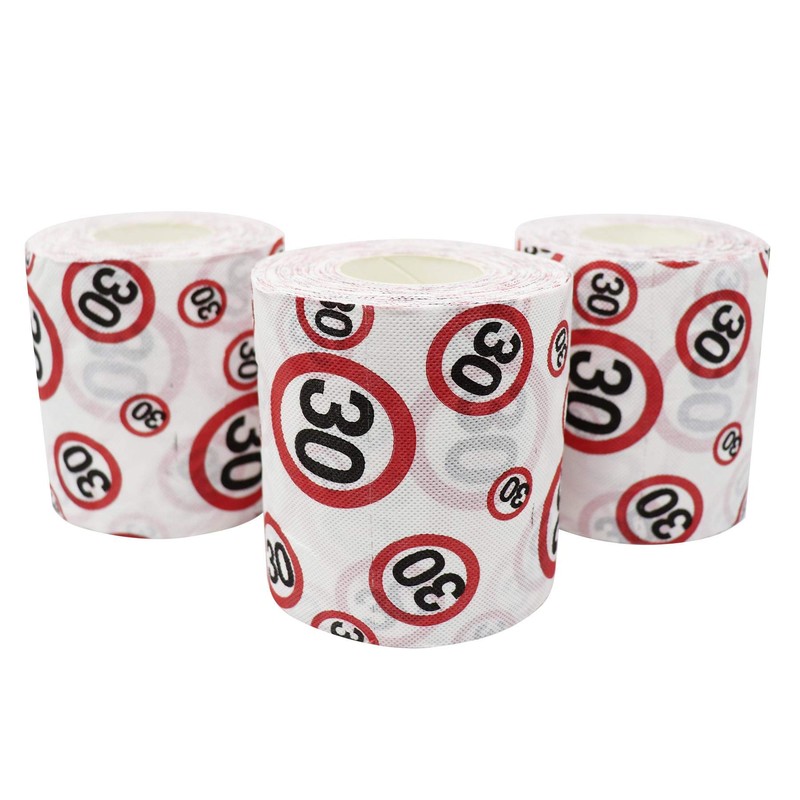 - Toilettenpapier 30, 3-er Set Geburtstagstoilettenpapier weiß, rot-schwarz bedruckt, aus Zellstoff.
