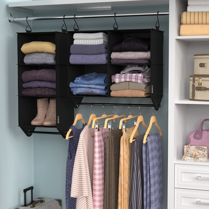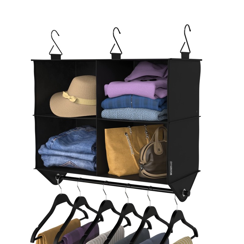 - 4-SHELF ORGANIZER WITH CLOSET ROD: Fabric hanging organizer features 4 open shelf compartments for shoes, folded clothes, hats, purses, towels, blankets & more; Create a double hang rod design with attached garment rod for hanging items