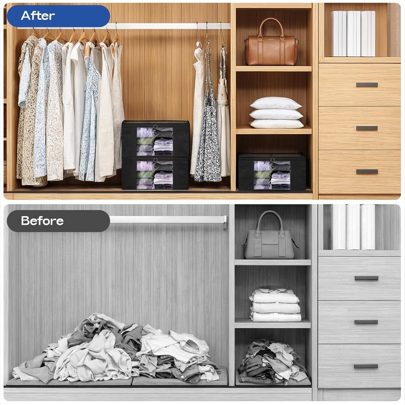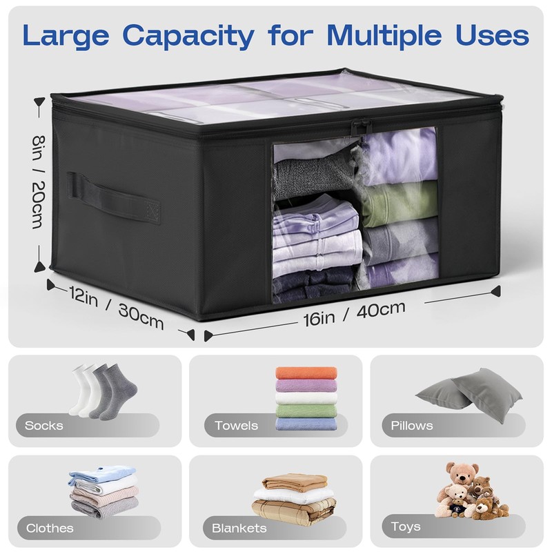 Clothes Storage Bags, Foldable Thick Fabric Blanket Storage Boxs, Large Clear Window with Reinforced Handle, Great for Clothes, Blankets, Closets, Pillows, Toys (Black, 4Pack)
