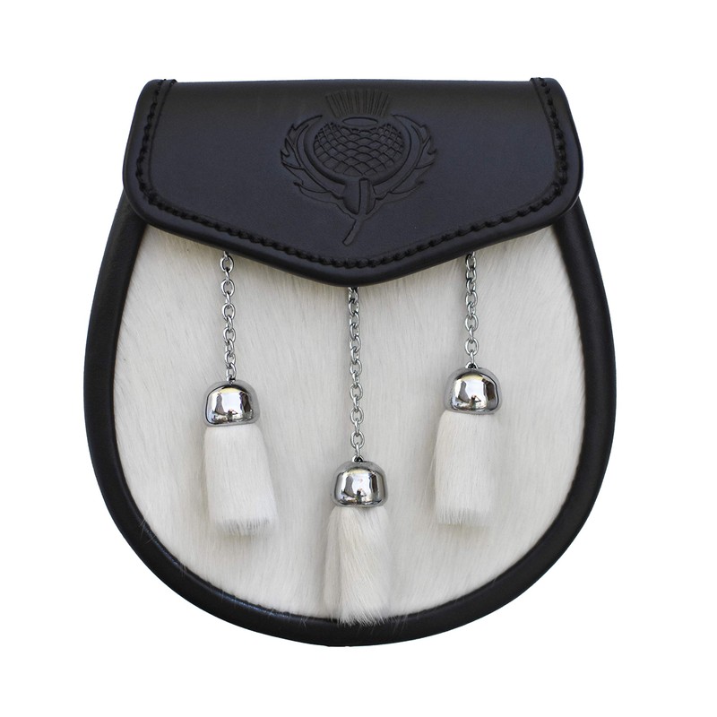 - Complete with adjustable chrome & leather sporran belt and chain