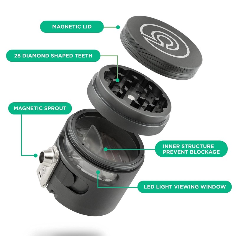 - VIABLE & SECURE CONTAINER- Your items are securely stashed behind a slidable dispensing gate secured by powerful magnets. Even better, your item is stored in a compartment with a beautiful LED lighted viewing window so you can easily check items quantity. The large size means the grinder holds a good supply of items.