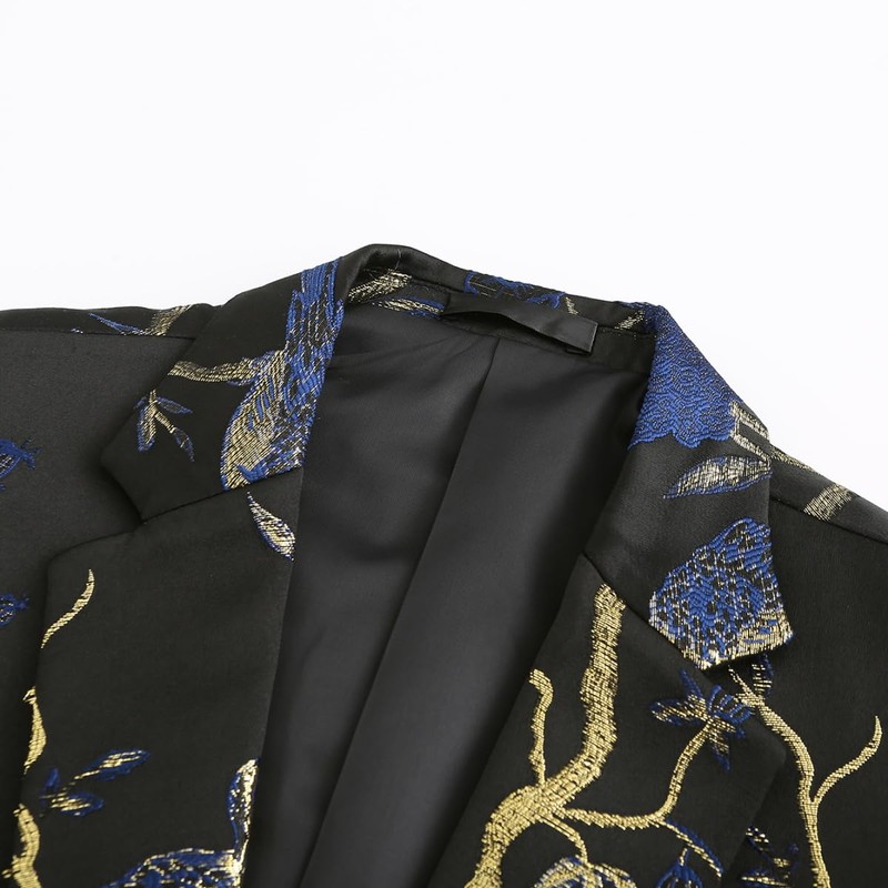 - Design: Top - one button, peaked lapel, three sleeve buttons, two flap side pockets, one chest pocket, random cutting exquisite embroidery pattern;Bottom - flat front pants come with adjustable waistband