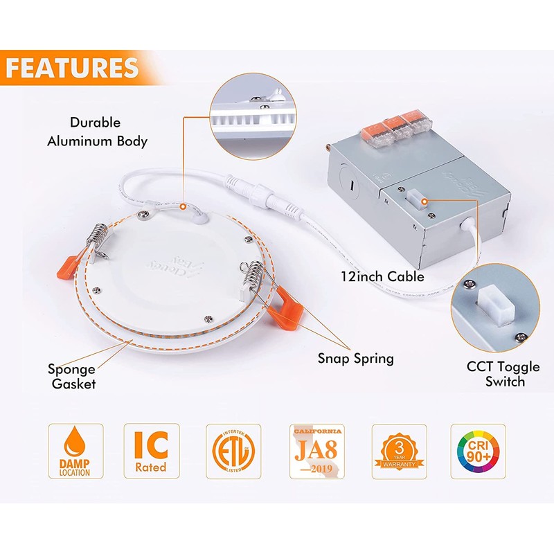 - Adjustable color temperature & dimmable brightness - LED Recessed Downlight gives you 3 color temperature options: 3000K,4000K and 5000K. You can use the CCT color temperature adjustable switch to change the color temperature from warm yellow light to cold white light easily and smoothly. Also you can adjust the brightness of the light from 5% to 100% according to different time and occasion. Different color temperature and brightness can meet your different ambience needs.