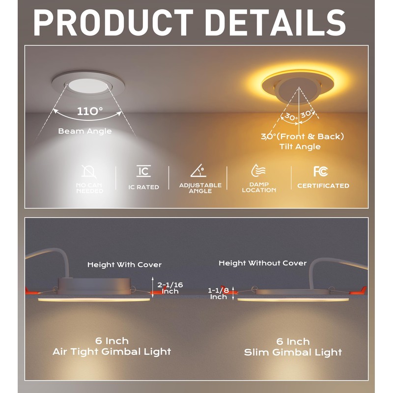 - Dimmable:The LED recessed light is 10% ~100% dimmable, allowing you to adjust the brightness to your liking. Whether you're looking for bright, task lighting or a soft, ambient glow, you can easily control the light output to suit your needs.