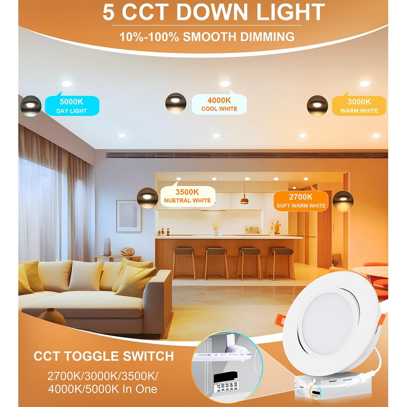 - With 5 clolor tempareture--2700K/3000K/3500K/4000K/5000K selectable, this LED recessed light allows you to customize the lighting to suit your needs. Whether you're looking for warm, cozy lighting or bright, cool lighting, you can find the perfect setting for any occasion.