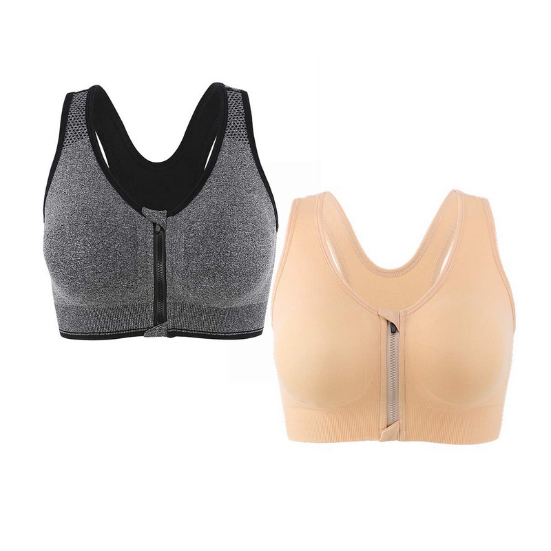 CLOUSPO Sports Bra Post Surgery Bra Zip Front Wireless with Removable Pads Yoga Bra for Workout Fitness(XL,Grey+Beige)