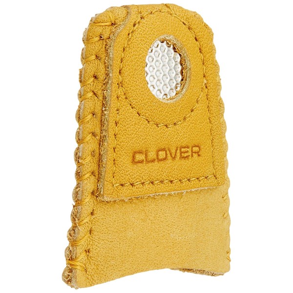 This is a medium coin thimble made of soft leather with a special dimpled metal coin disc for fingertip protection. Main body: Leather/Metal: Brass. Leather thimble measures 1.6 high by 1.4 wide.