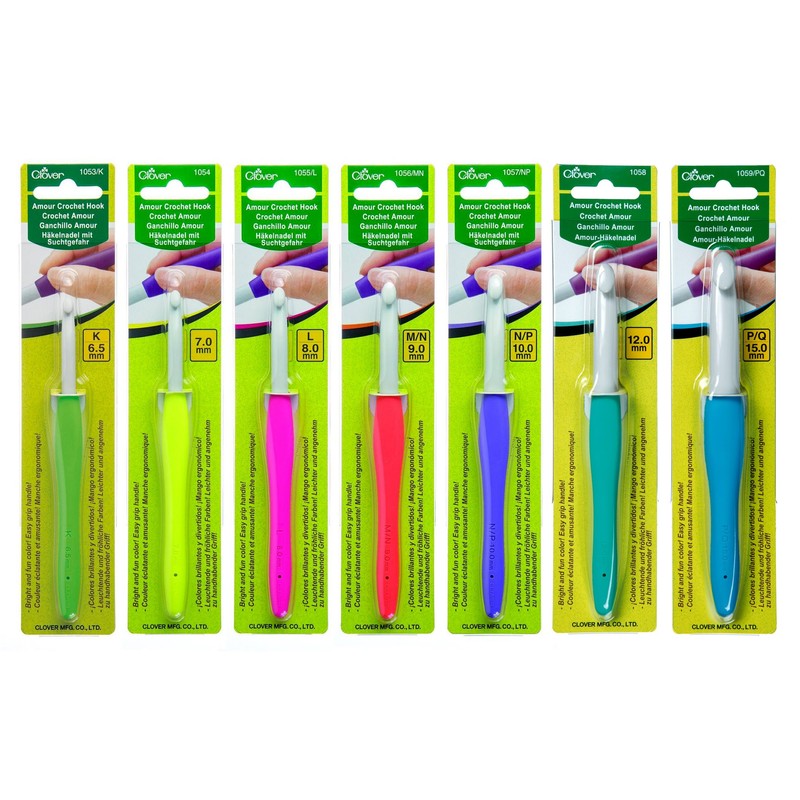 - This incredibly smooth hooks allows yarn to slide effortlessly. Amour Crochet Hooks have signature handles in vibrant colours for easy size identification. The crochet hook handle is made from elastomer rubber, making crocheting comfortable and stress free for extended time periods. This large sized hook is the perfect tool for working with thick yarns.